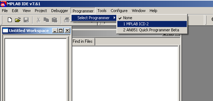 Select program, quindi selezionare il programmatore.(Nell'esempio MPLAB