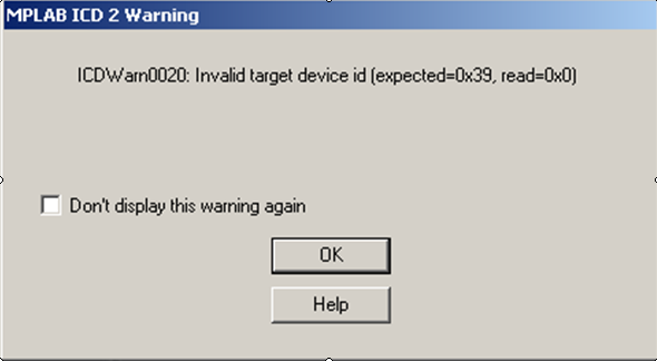 | Verrà presentato il mesaggio "ICDWarn0020: Invalid Targhet device id(expected=0x39,read=0x0)" Fig.3.