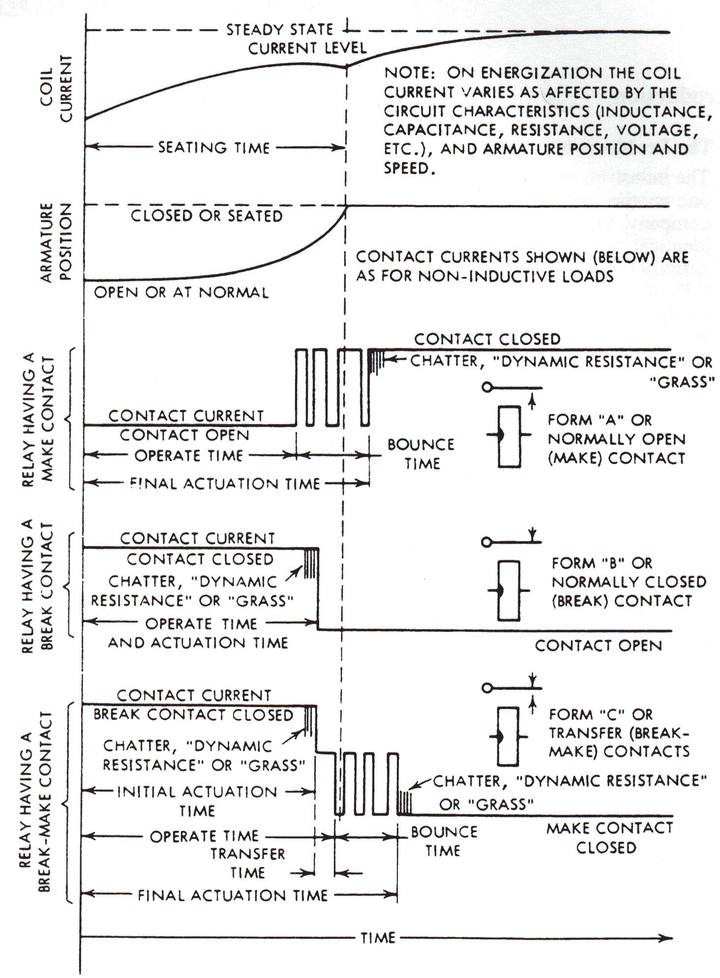 In un relè si definiscono Pull-in e Drop-out, le grandezze (tensione o corrente a seconda del pilotaggio) misurate al momento che il relè viene, rispettivamente, eccitato oppure rilasciato; per capire meglio diciamo che la tensione indicata per il funzionamento di un relè è una grandezza nominale, una grandezza standard di funzionamento intorno alla quale va di norma fatto funzionare il dispositivo in modo da non avere malfunzionamenti; detto questo possiamo intuire che non può essere una grandezza critica; ad esempio se il relè è definito per una tensione nominale 12 Vdc non avremo l'eccitazione a 11,9 Vdc ma ad una tensione molto più bassa, questa è la tensione di Pull-In. Per quanto riguarda il Drop-out, lo possiamo vedere come la tensione alla quale viene a mancare l'eccitazione del relè. Lo stesso discorso va fatto se il relè viene pilotato in corrente, considerando quindi la corrente di Pull-in e di Drop-out. La misurazione di queste grandezze viene fatta con un metodo chiamato a doppia rampa. In pratica per il Pull-in si alimenta il relè con una rampa di tensione abbastanza ripida, nel momento in cui si avverte lo scatto si arresta la rampa, la tensione di Pull-in è appena al di sotto di questa; per avere però una misura più precisa, si abbassa la tensione di alimentazione di un tot, in modo da diseccitare il relè alimentandolo appena sotto soglia e si ricomincia ad incrementare la tensione con una rampa molto meno ripida della precedente, fino ad avere un nuovo stato di eccitazione al quale si misurerà la tensione di Pull-in. Per il Drop-out il procedimento è analogo e inverso. Si usa questa metodologia per velocizzare la procedura di misura, in questo modo si trova rapidamente la finestra di tensione che ci interessa e quindi si effettua una misura precisa solo in questa zona.